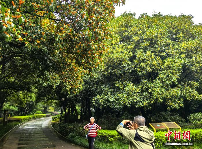 图为二位搭客正在桂林园林动物园赏桂。李腾钊 摄